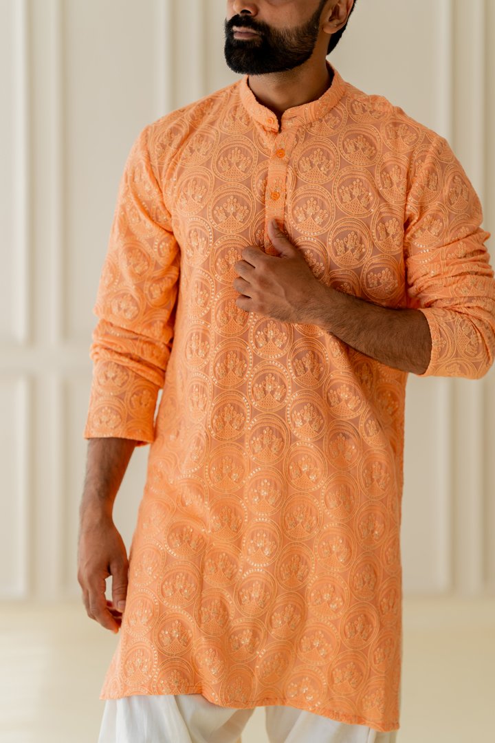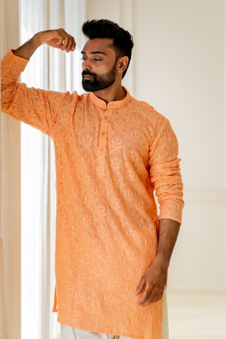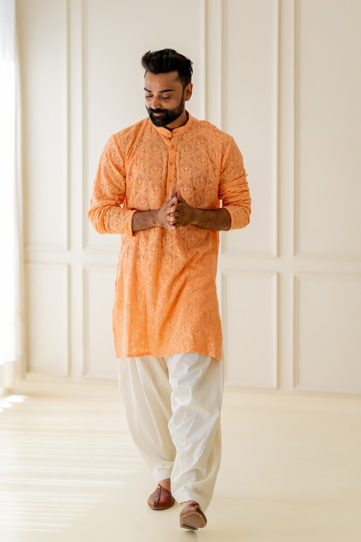 Coral thread work kurta teamed with ivory patiala. Make a statement that honours heritage & celebrates style