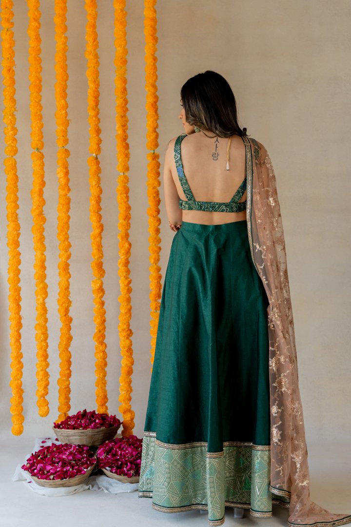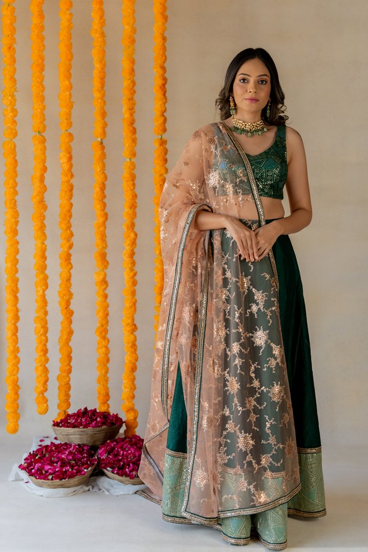 Deep green silk lehenga with a stylised blouse & peach overall floral embroidered dupatta