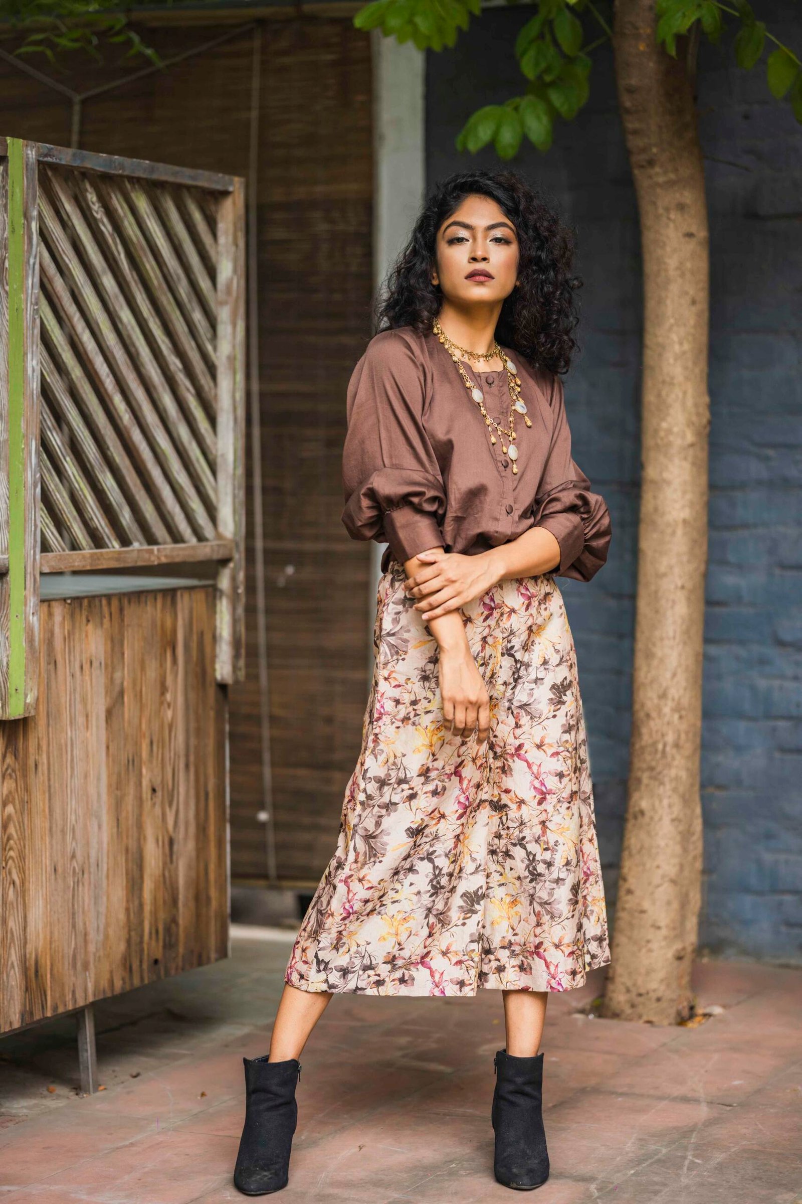 Fawn floral printed culotte teamed with a solid shirt with a sleeve detail