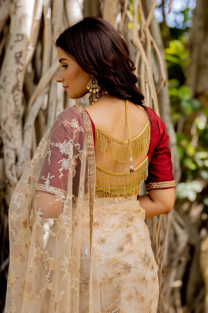 Gold net saree with silk backless blouse comes with a modal satin petticoa