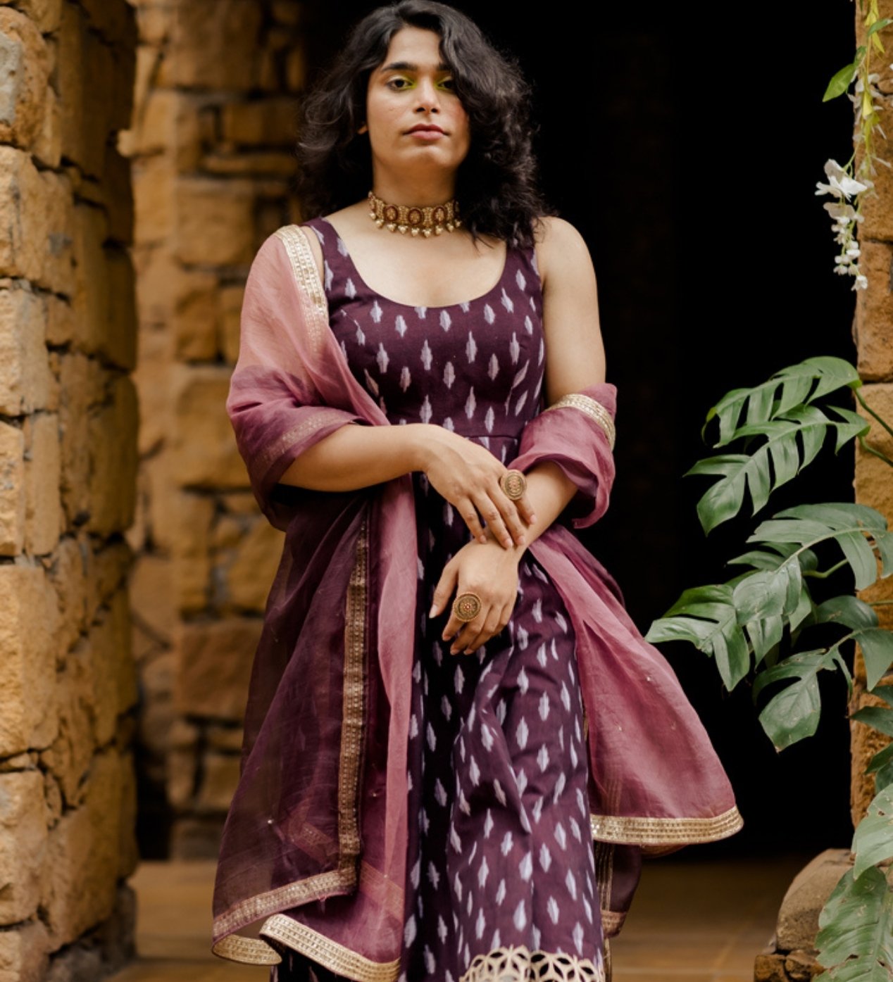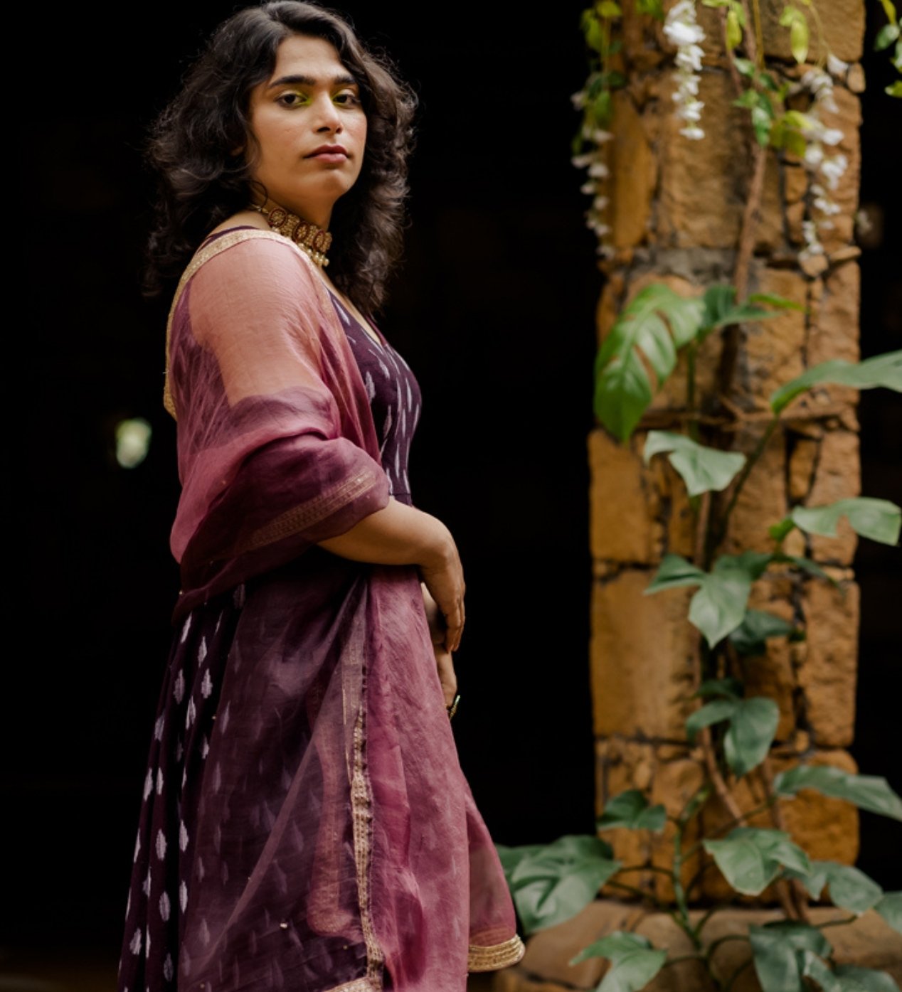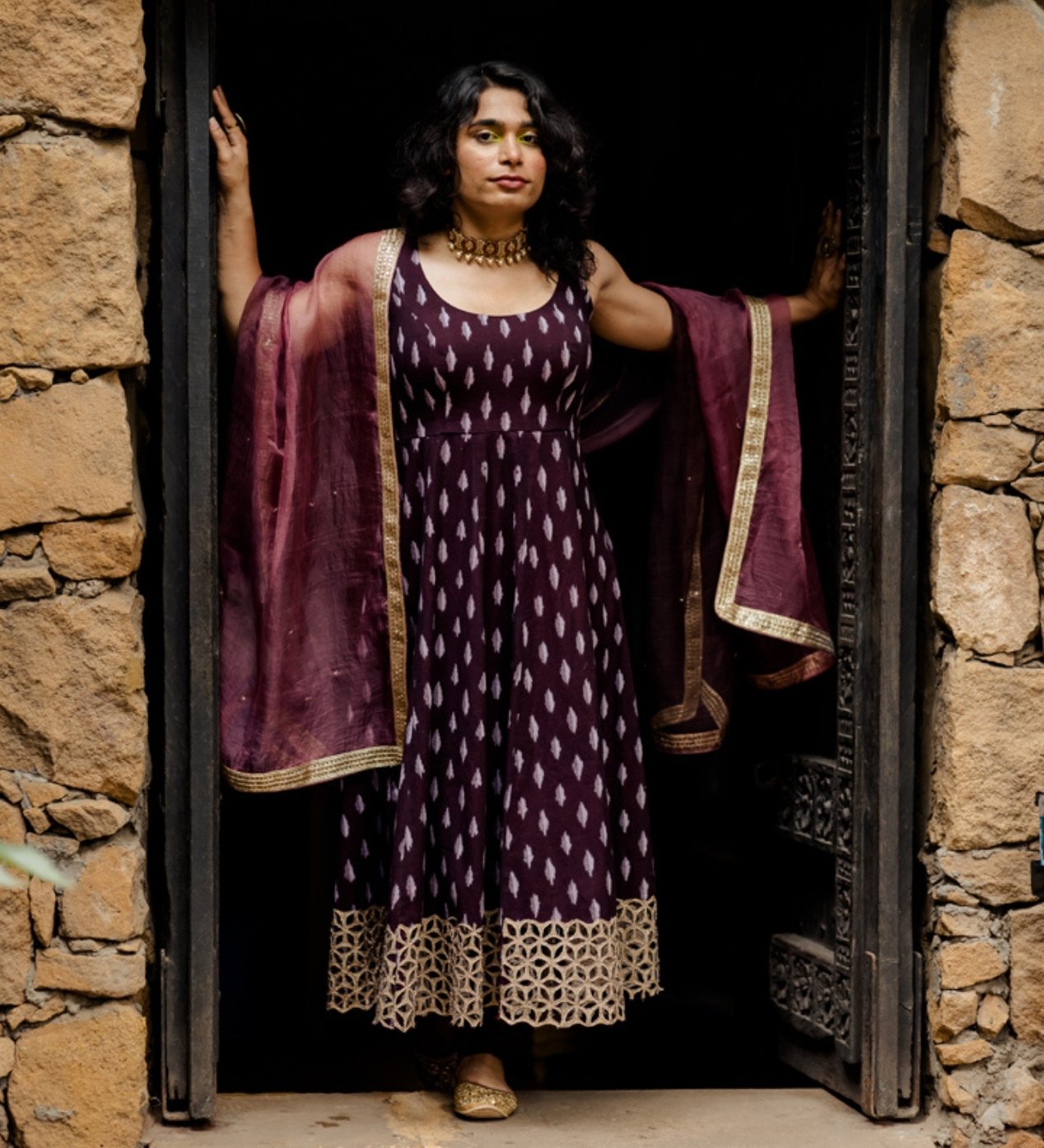 Aubergine anarkali with zari & cutwork embellishment teamed with a matching chudidar & ombre organza dupatta.