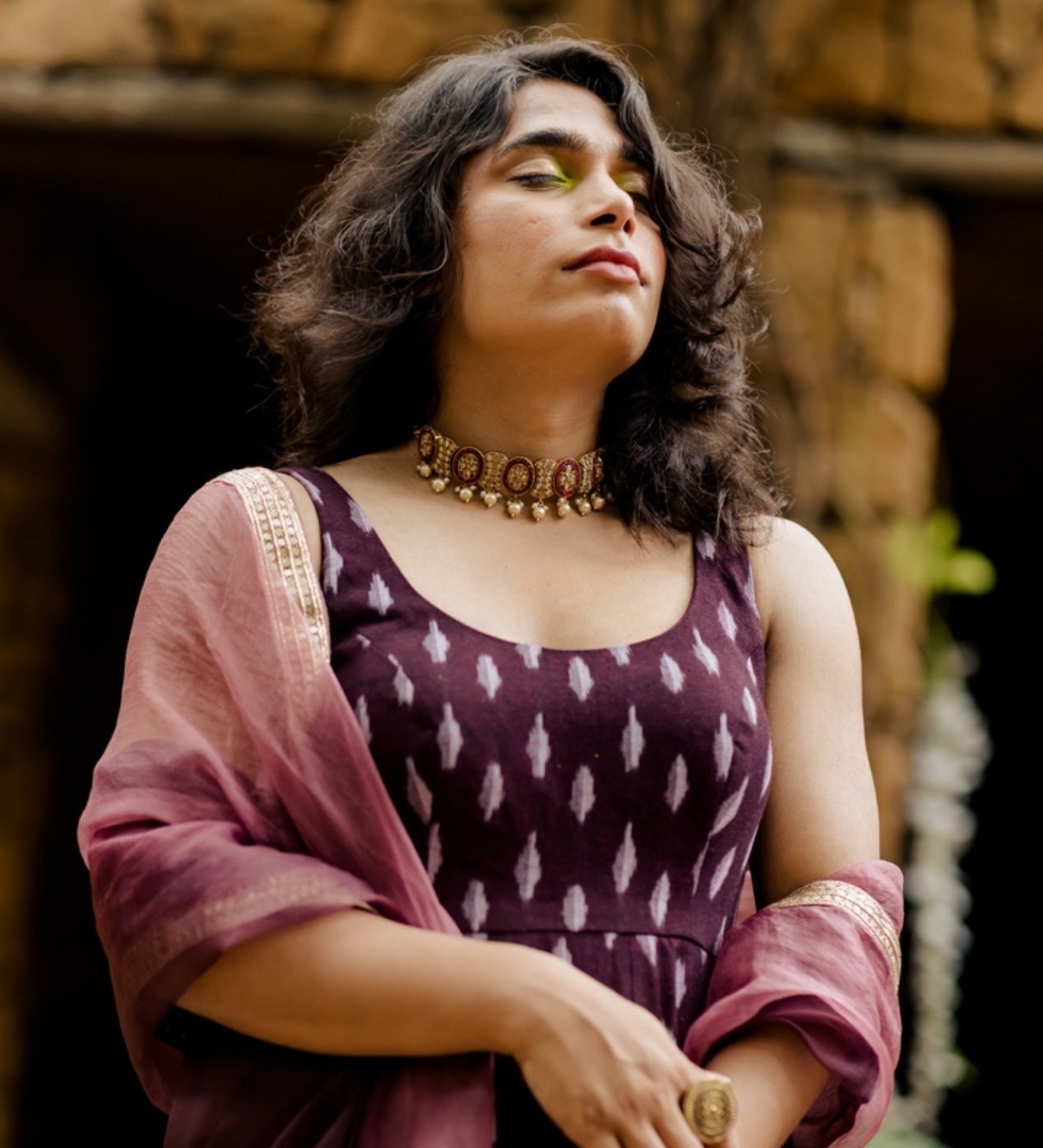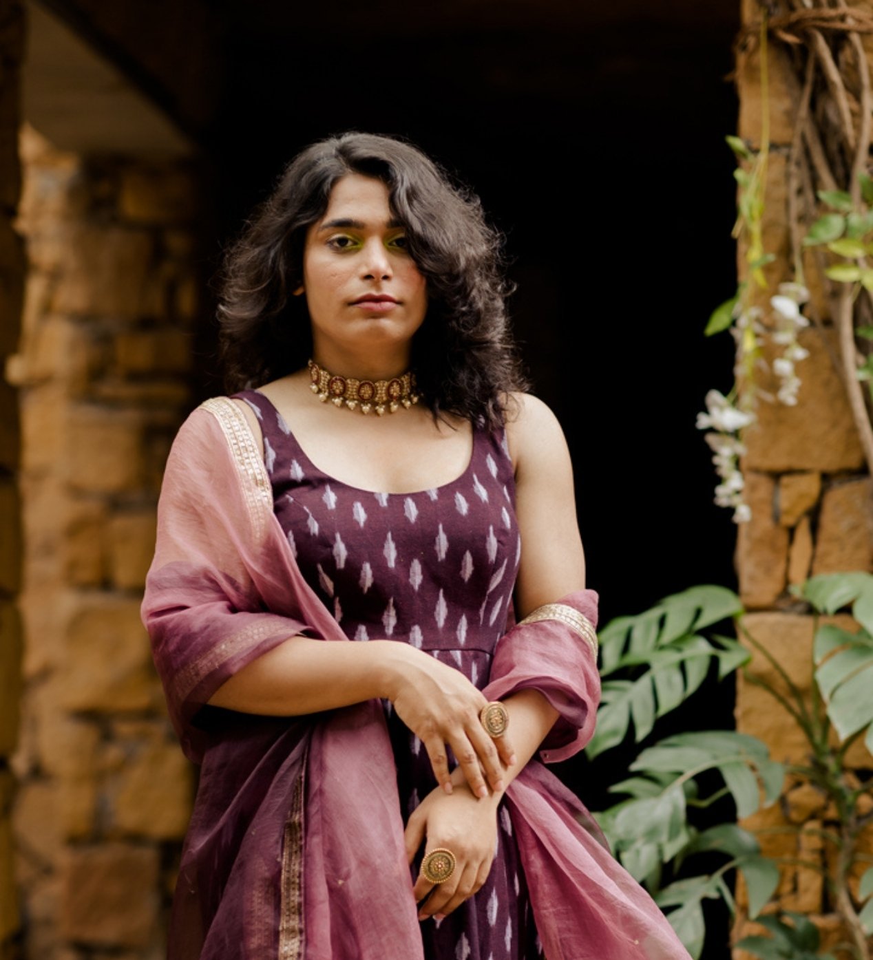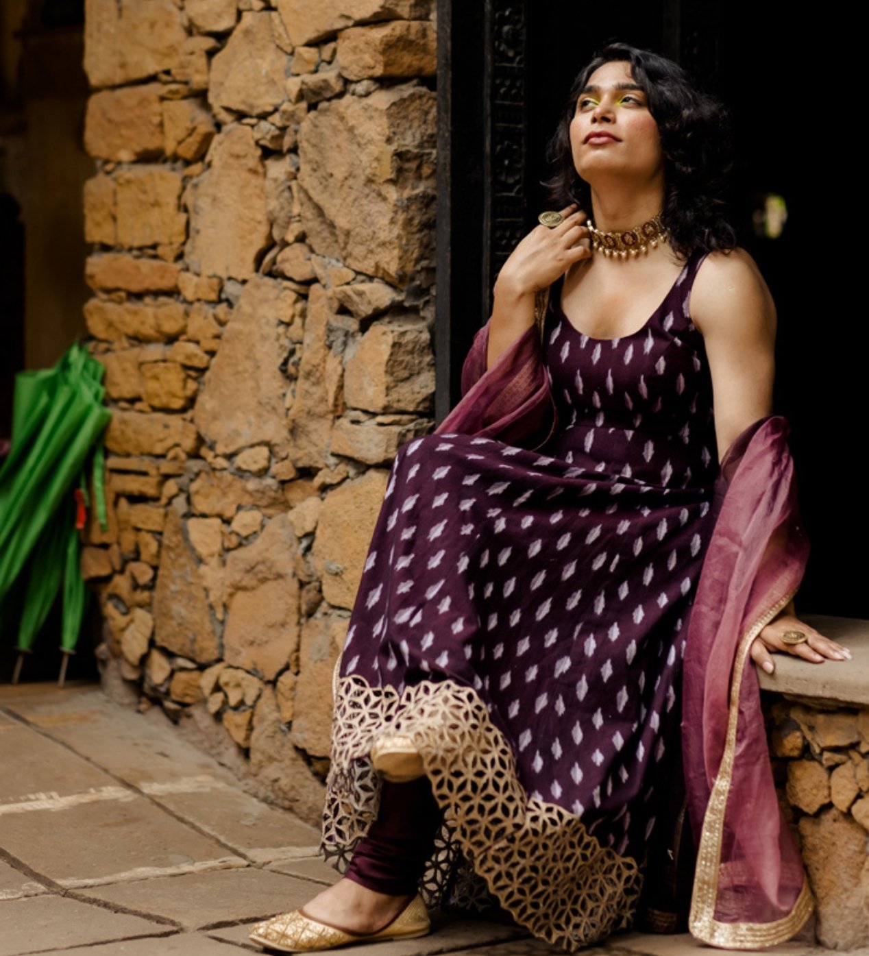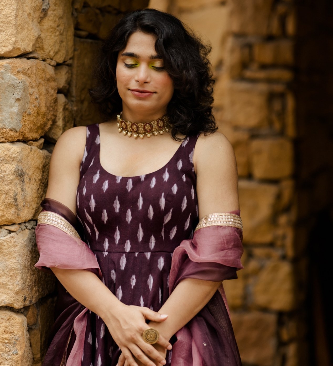 Aubergine anarkali with zari & cutwork embellishment teamed with a matching chudidar & ombre organza dupatta.