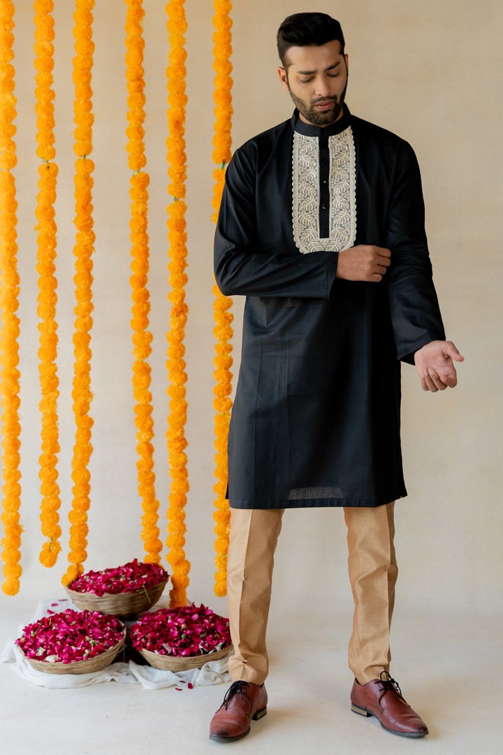 The ink black cotton kurta with ivory thread work is teamed with antique gold pants.