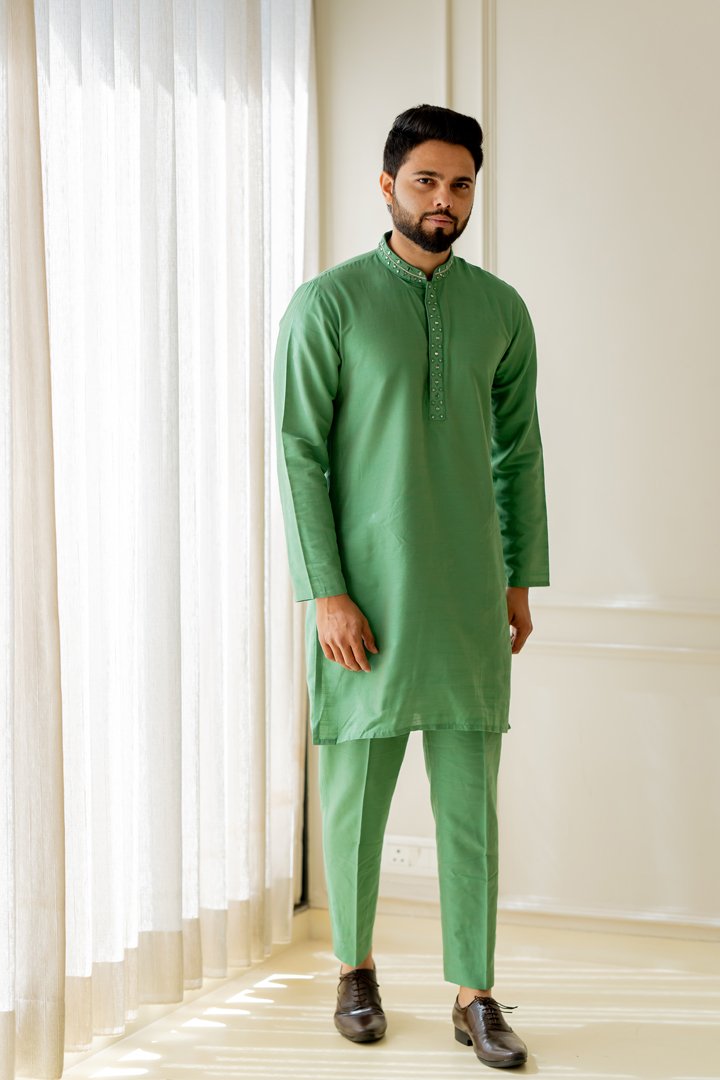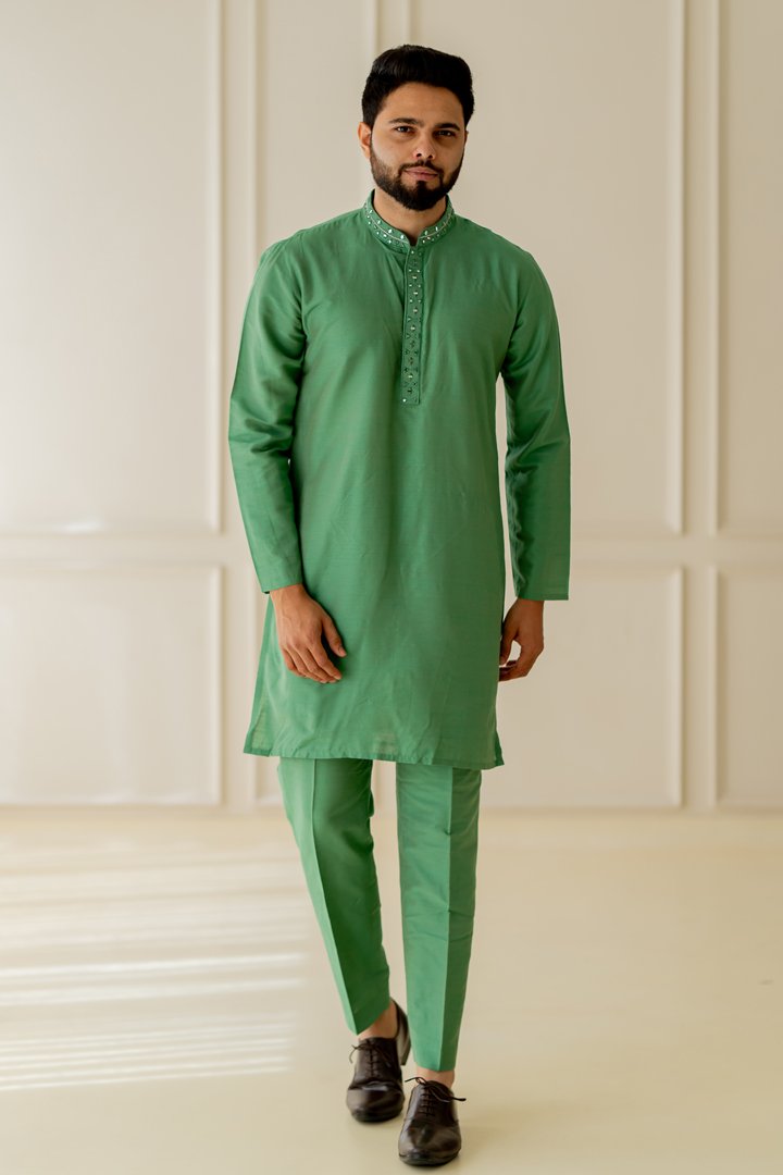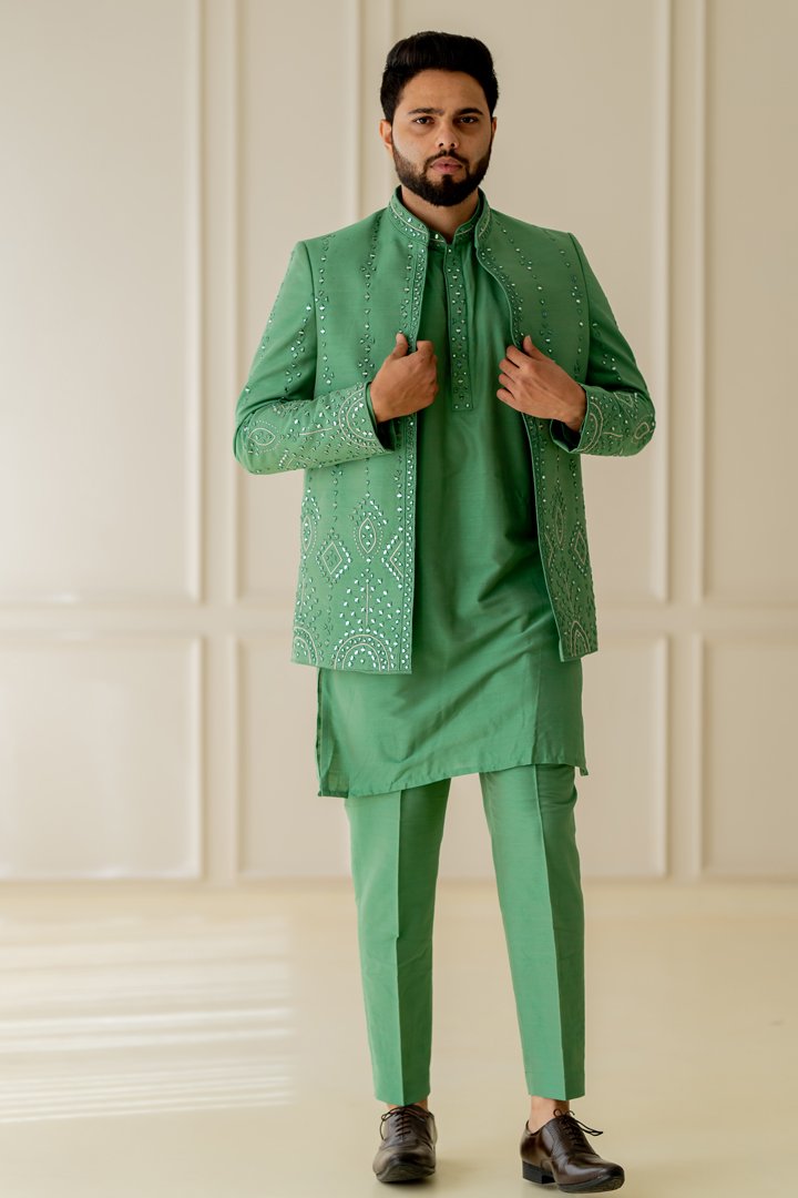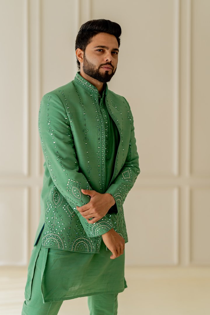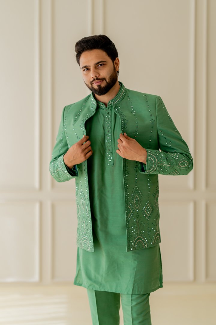 Jade green mirror embroidered 3 piece indowestern set for all your festive needs.