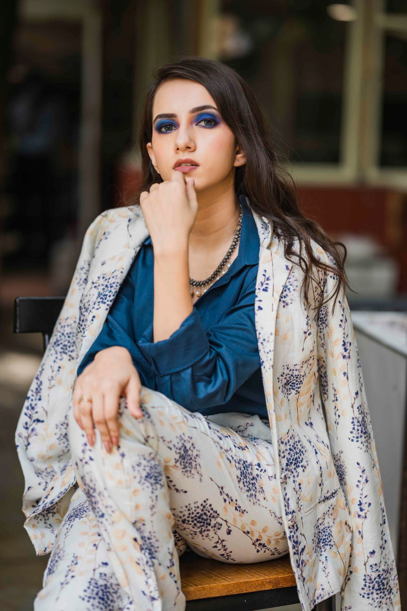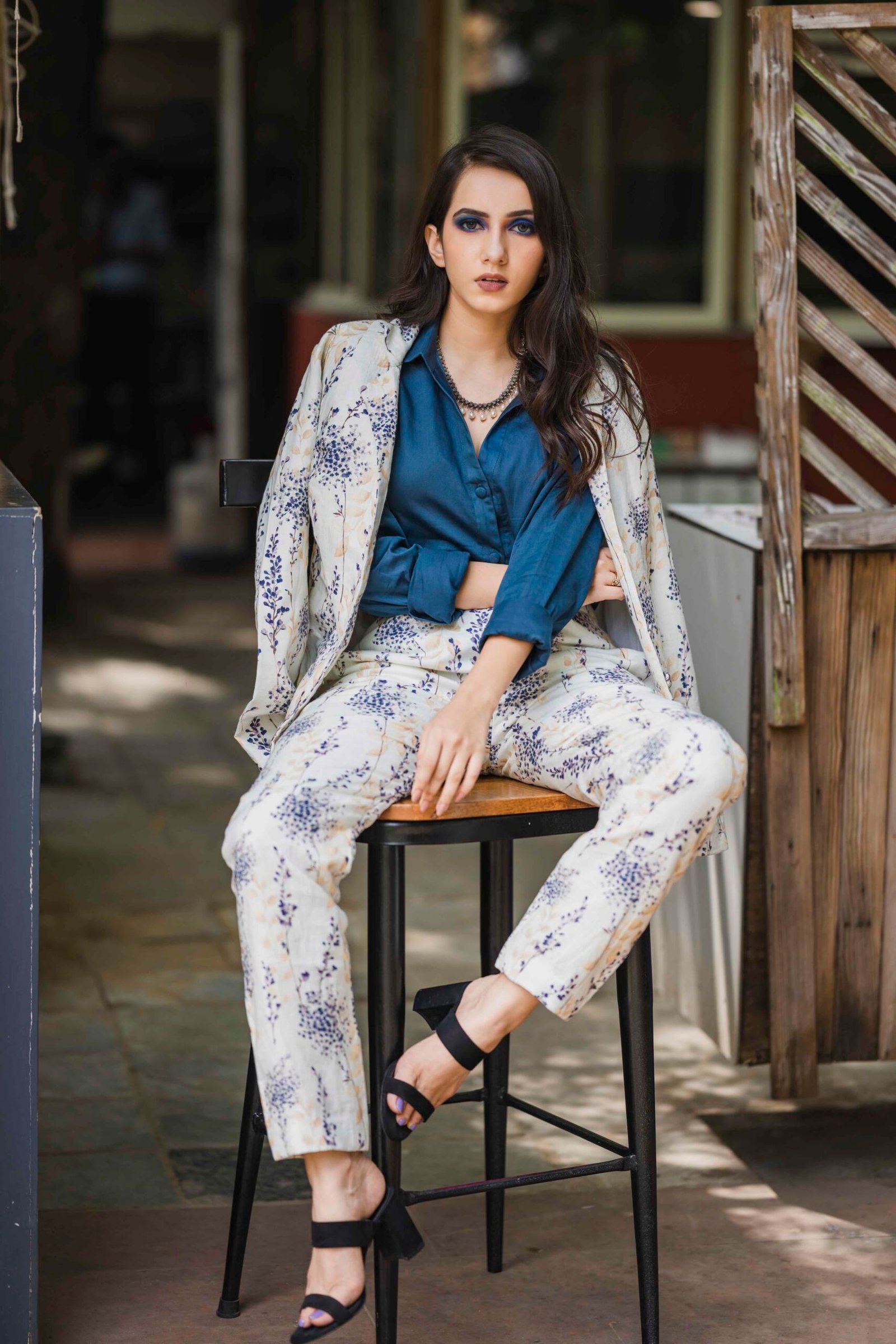 Ivory linen floral blazer with co ordinated pants teamed with a contrast cambric shirt.