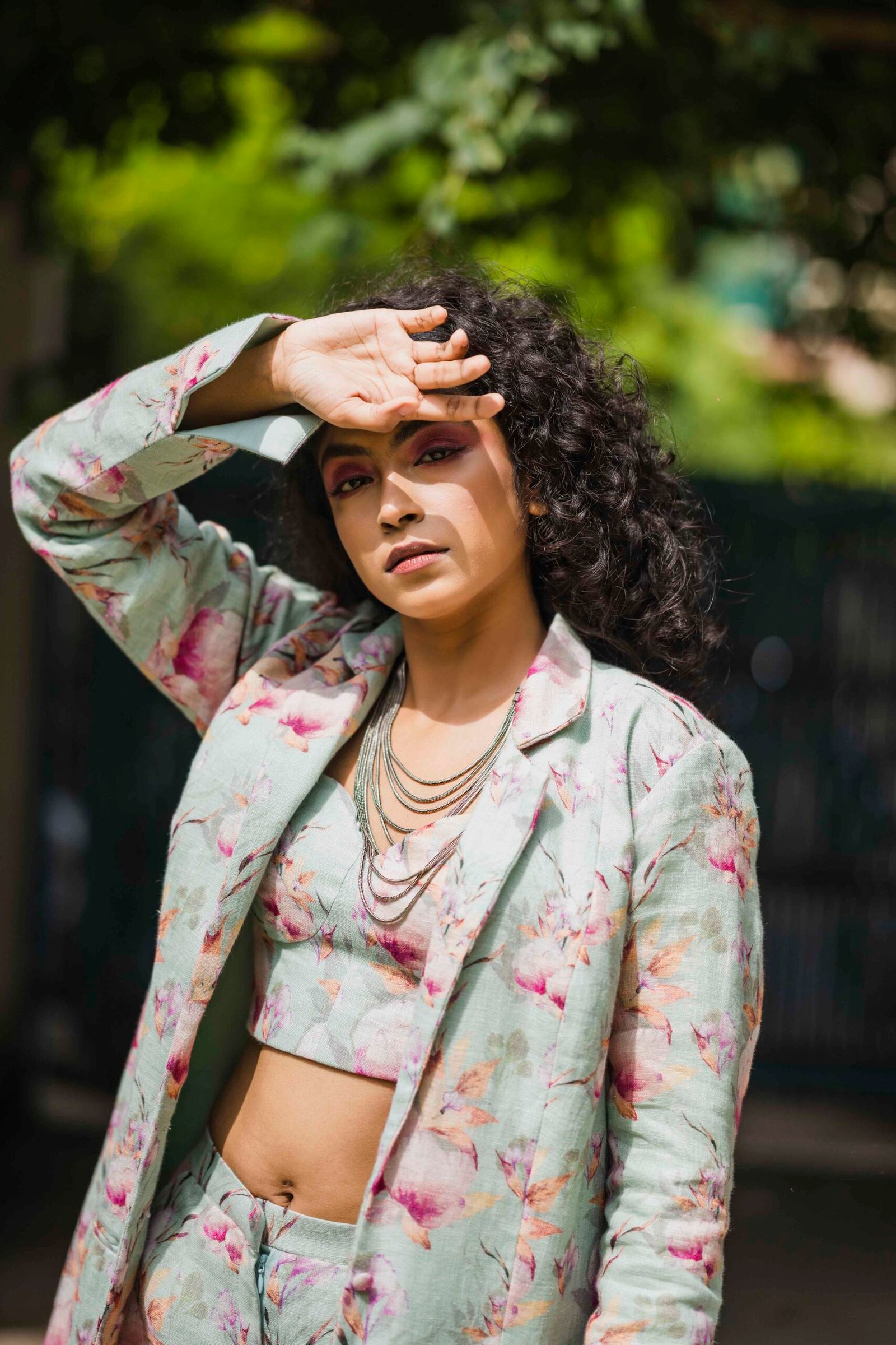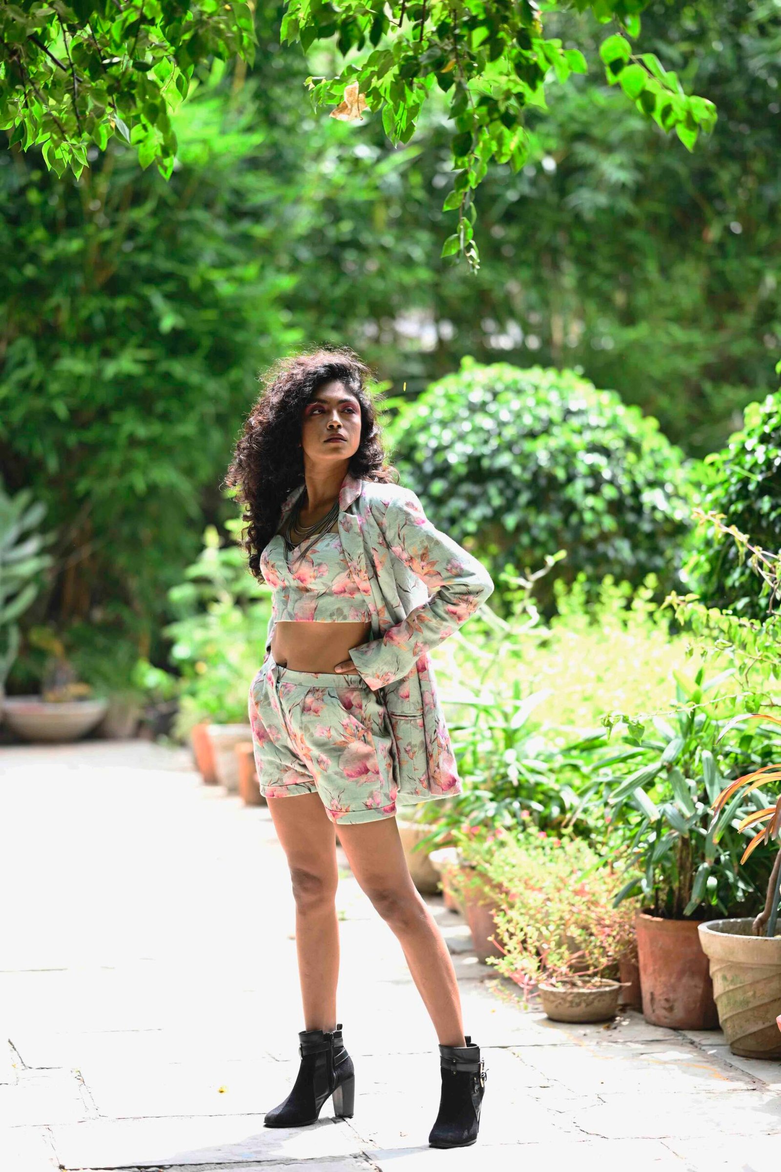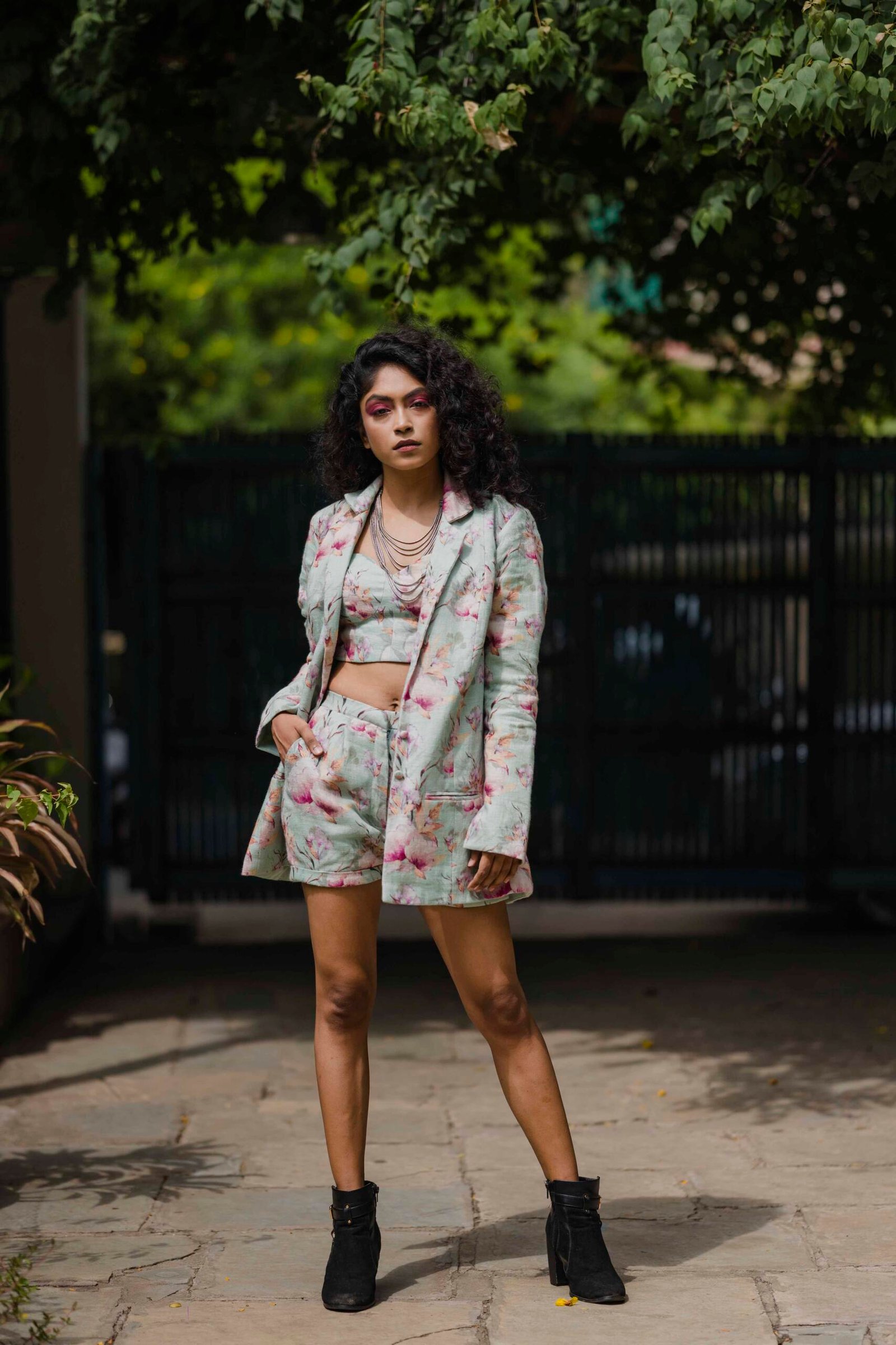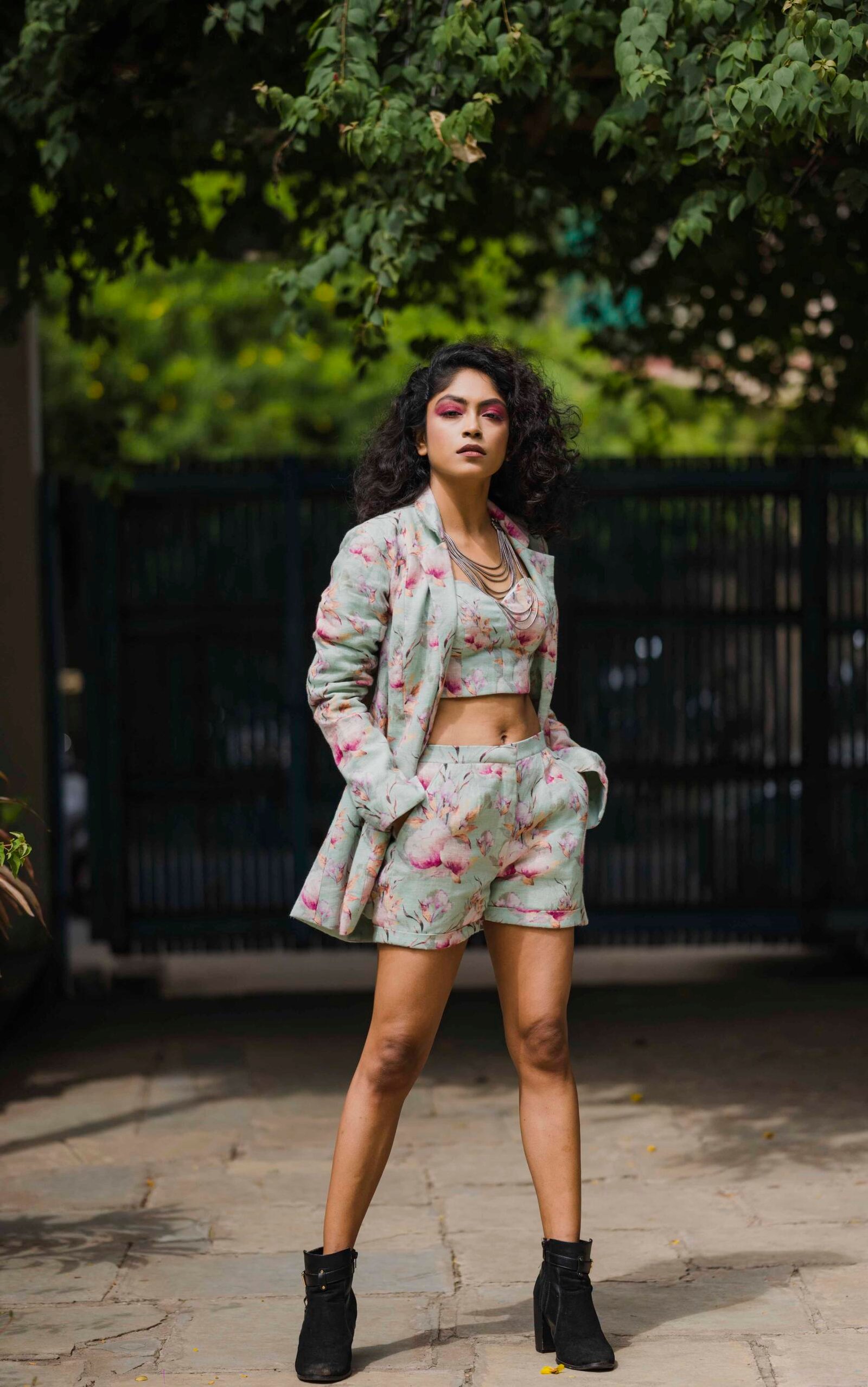 Mint floral printed blazer teamed with a bustier top &; shorts.