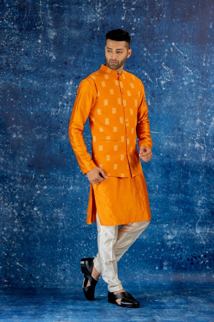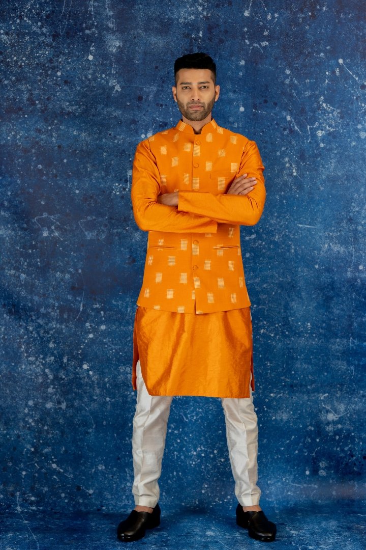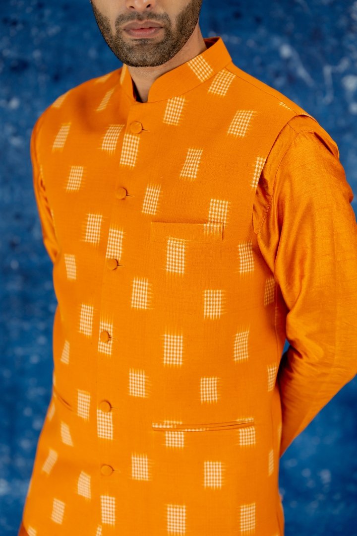 HomeBundiMarie Gold Yellow Double ikat bundi set Marie Gold Yellow Double ikat bundi set₹10,500.00 Cotton double Ikat Bundi teamed with co ordinated Silk kurta pant set. Kurta Pant Fabric: Silk Bundi Fabric: Cotton ikat Marie Gold Yellow Double ikat bundi set quantity Buy now Add to WishlistRemove from Wishlist Add to Wishlist Categories: Bundi, Men Product ID: 20401 Reviews (0) Reviews There are no reviews yet. Be the first to review “Marie Gold Yellow Double ikat bundi set”Your email address will not be published. Required fields are marked *Name Email Your rating * Rate… Perfect Good Average Not that bad Very poor Your review * I agree that my submitted data is being collected and stored. Related products Add to WishlistRemove from Wishlist Add to Wishlist Gold Sequi sence sheet Sherwani ₹20,500.00 Buy now Add to WishlistRemove from Wishlist Add to Wishlist Soft Pink Tissue Bundi Set ₹11,200.00 Buy now Add to WishlistRemove from Wishlist Add to Wishlist Royal Mint Sherwani Set ₹20,500.00 Buy now