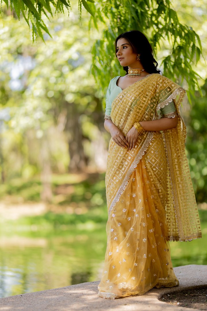 Net patterned saree teamed with a contrast mint tissue blouse & modal satin petticoat
